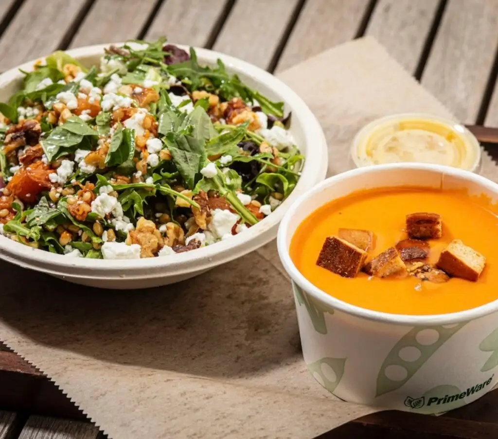 one of our fall favorite combos! roasted butternut squash, carrots, onions, cinnamon, and nutmeg, topped with fresh dill and spiced pumpkin seeds with your choice of a freshly prepared seasonal salad.